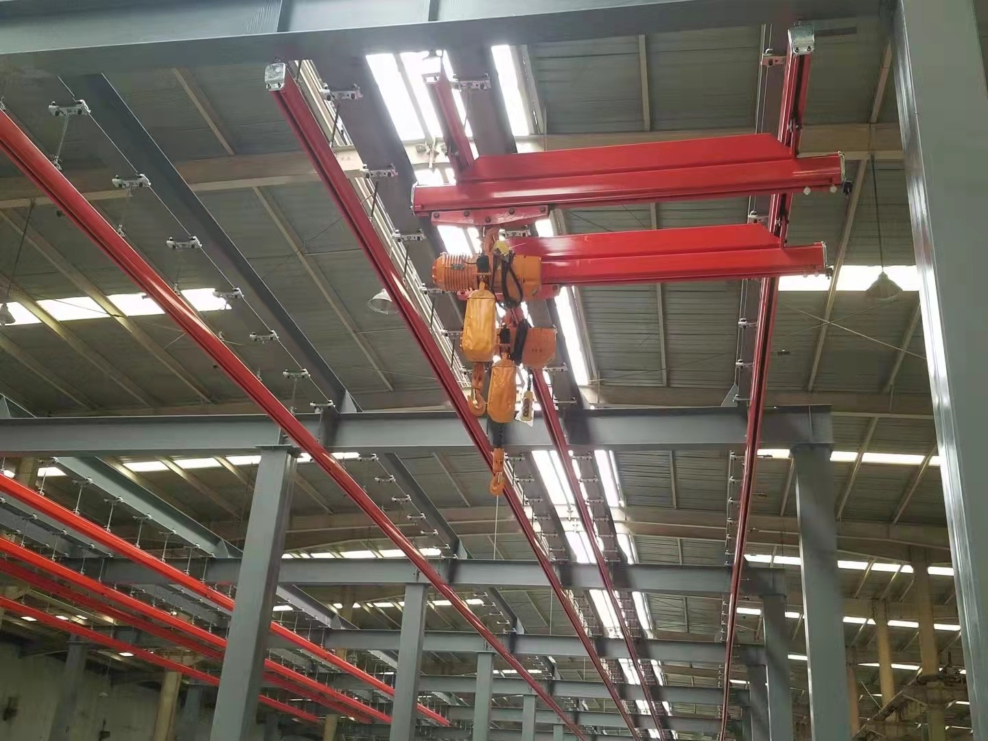 KBK起重機(jī)標(biāo)準(zhǔn)組件。由懸掛裝置、軌道、道岔、行走小車(chē)、電動(dòng)葫蘆、移動(dòng)供電裝置(滑線(xiàn))以及控制裝置等組件組合而成,起升裝置主要采用環(huán)鏈電動(dòng)葫蘆,也可吊掛一些機(jī)械手或焊槍之類(lèi),作為工具滑軌使用,起重量一般不超2000kg。