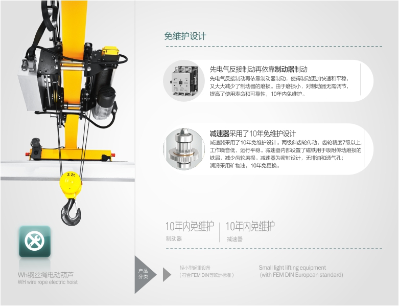 節(jié)能環(huán) 保等優(yōu)勢。電動葫蘆應用8項專利技術,零部件采用模塊化制造工藝,通用性強,免維護率高,易損件少。