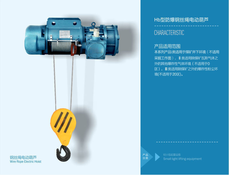 4、 防爆鋼絲繩電動葫蘆起重量為1t-32t,工作環(huán)境溫度為-25℃~40℃。