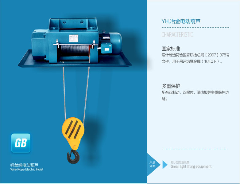 2、 冶金電動葫蘆具有雙制動、雙限位、隔熱板等多種保護(hù)功能。