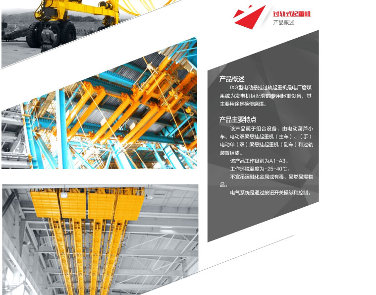 1、 XG型電動懸掛過軌起重機(jī)是電廠磨煤系統(tǒng)為發(fā)電機(jī)組配套的專用起重設(shè)備,其主要用途是檢修磨煤。