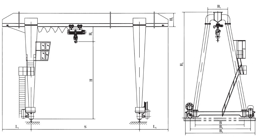 1、 MH型電動(dòng)葫蘆門式起重機(jī)與CD1、MD1等型號(hào)的電動(dòng)葫蘆配套使用,是一種有軌運(yùn)行的中小型起重機(jī)。