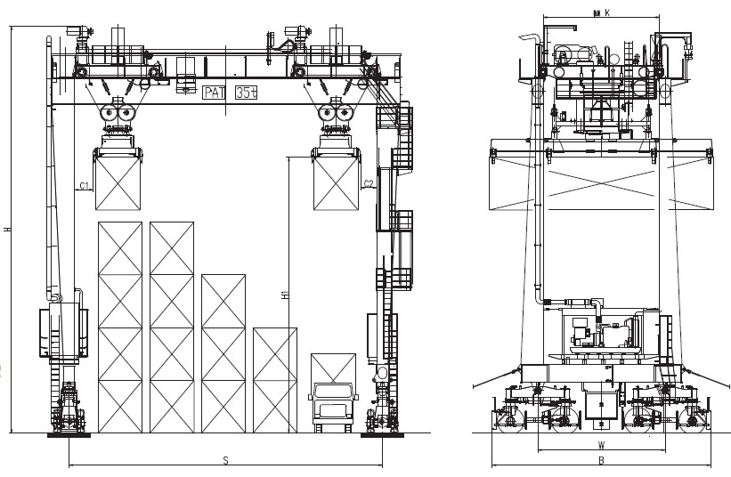 2、 采用專用集裝箱吊具,可起吊20、40、45標(biāo)準(zhǔn)集裝箱及液壓儲存罐。