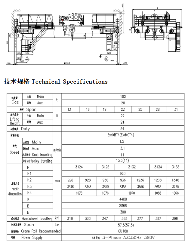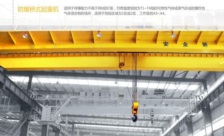 1、 QB型防爆吊鉤橋式起重機所有電機、電器防爆性能符合GB3836.2-2000《爆炸性氣體環(huán)境用防爆電氣設(shè)備第2部分:隔爆型“d”》,整機性能符合JB/T5897-2006《防爆橋式起重機》標準之規(guī)定,經(jīng)國家指定的防爆產(chǎn)品檢驗單位檢驗合同,取得了《防爆合格證》。防爆標志分別為ExdⅡBT4、ExdⅡCT4。
