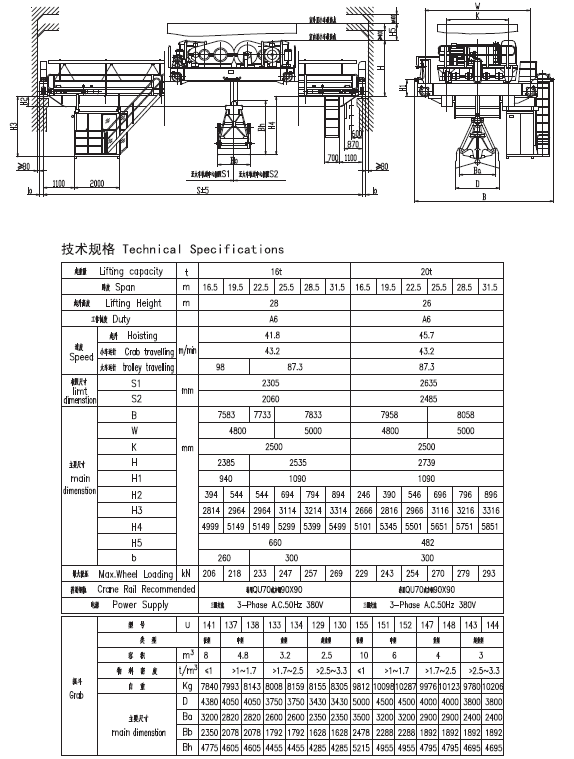 6、 取物裝置為雙卷筒的四繩抓斗,結(jié)構(gòu)簡(jiǎn)單,工作可靠。抓斗可在任意高度張開(kāi)和閉合。